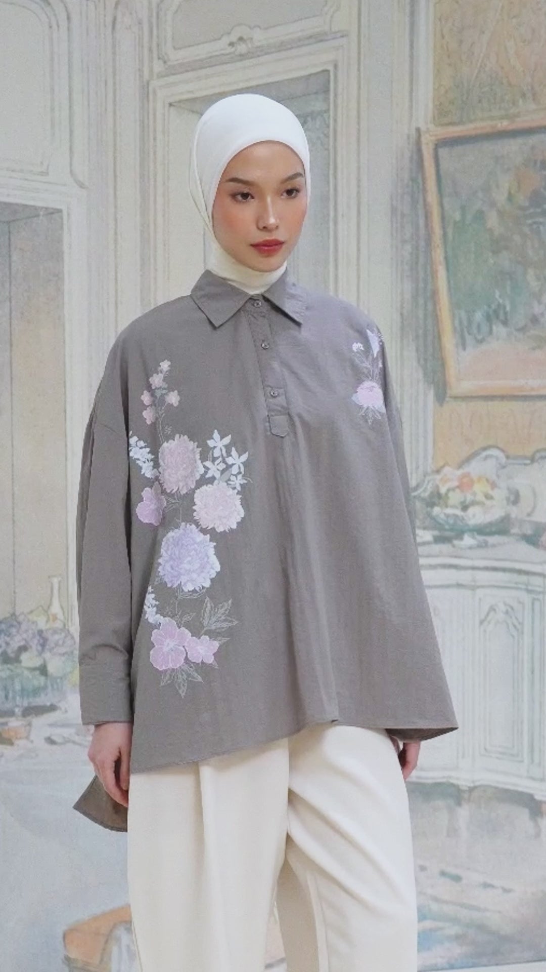 Detail: Kerah kemeja, hidden button depan, flower dtf sablon, lengan manset