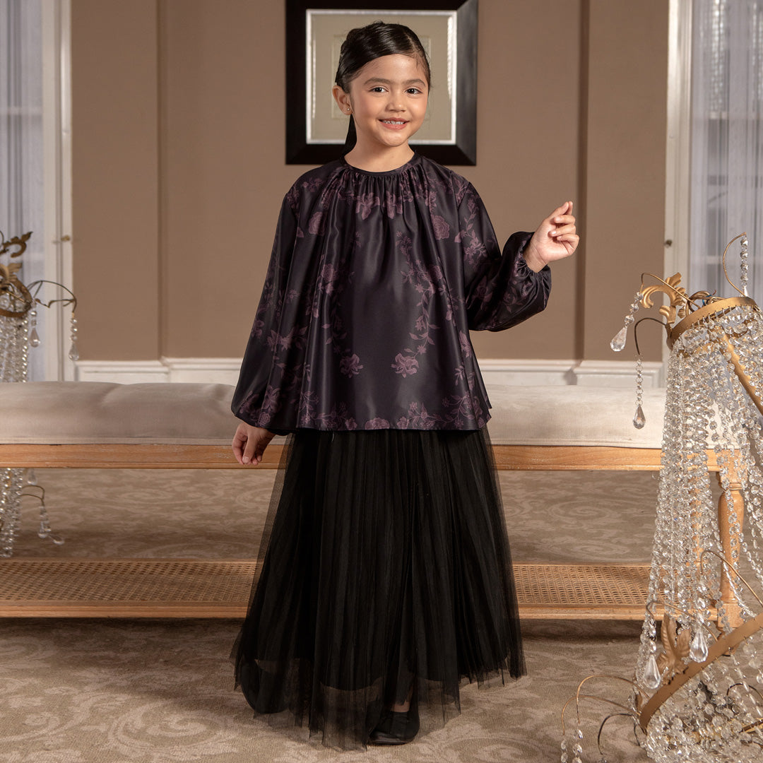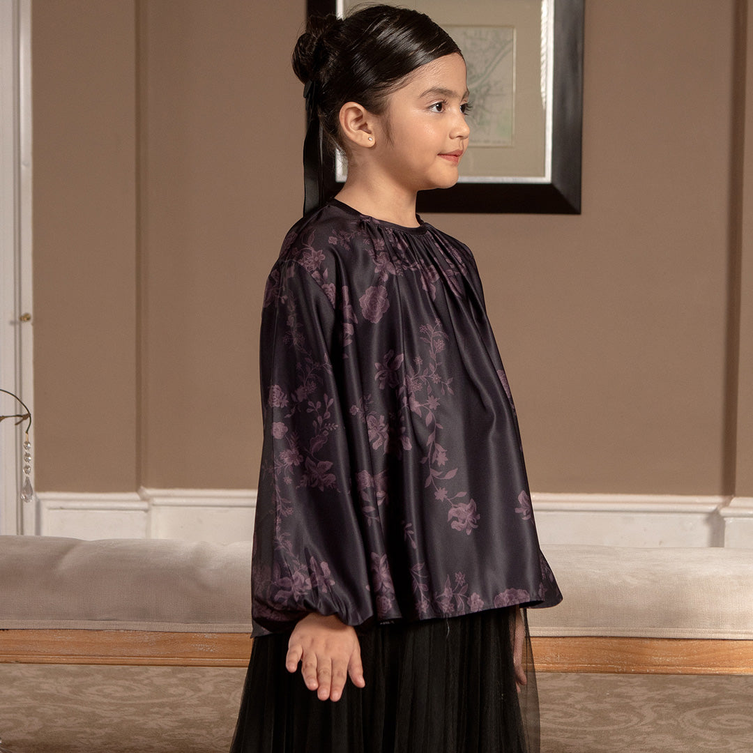 Detail Baju : Silhouette tops anak dengan cutting longgar, lengan puff ruffle, dan motif floral satin yang lembut