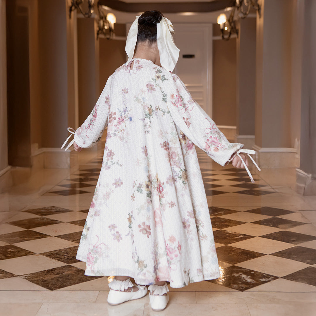 Detail : Silhouette A-line dengan aksen floral print, kerah bulat, detail lengan puff ringan, dan cutting jatuh anggun