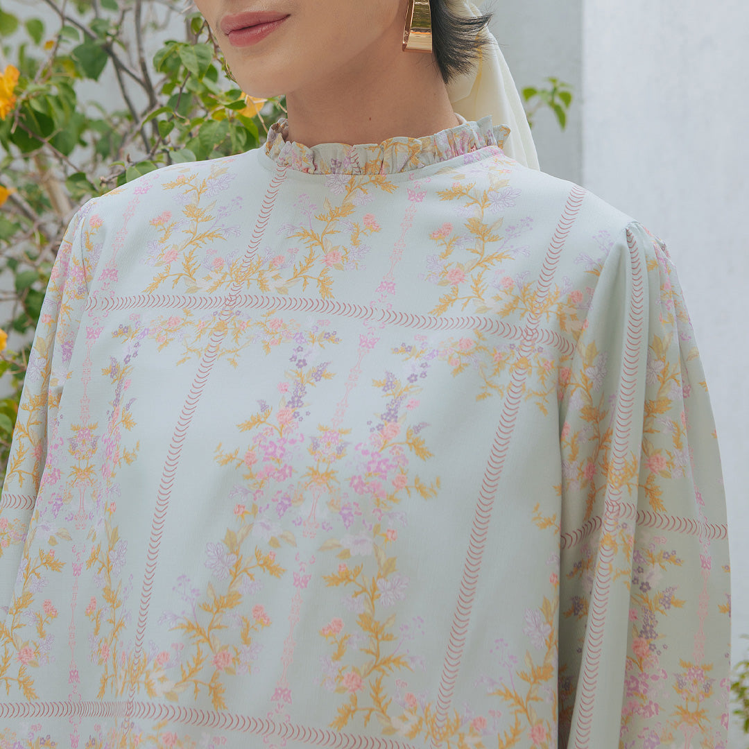 Detail : Silhouette boxy–loose, potongan lurus dengan detail jahitan panel, kerah kemeja, lengan panjang bermanset, motif floral pastel, detail ruffle leher.