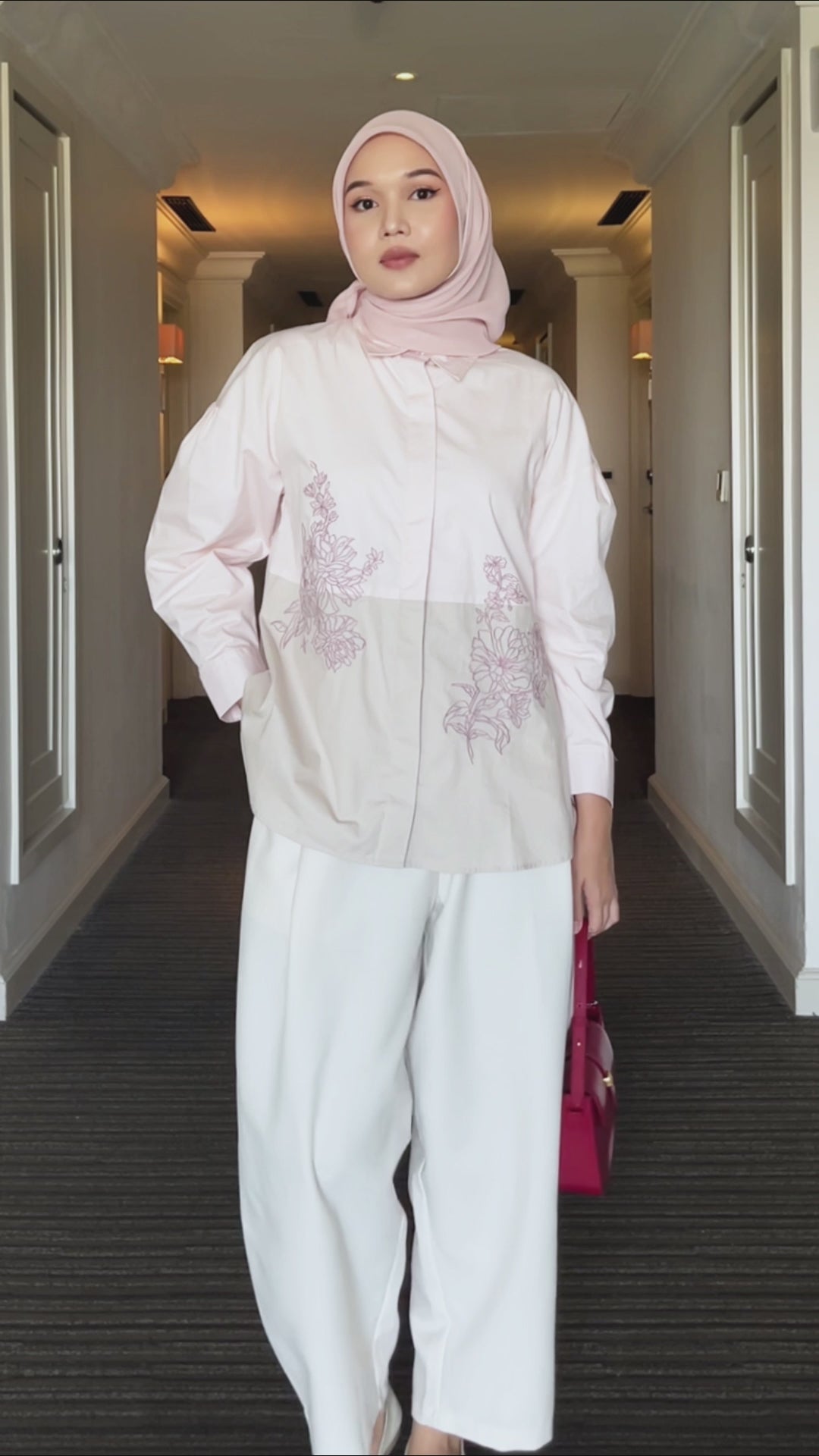 Detail: Two tone color, kerah kemeja, hidden button, detail embrodery (bordir), lengan manset