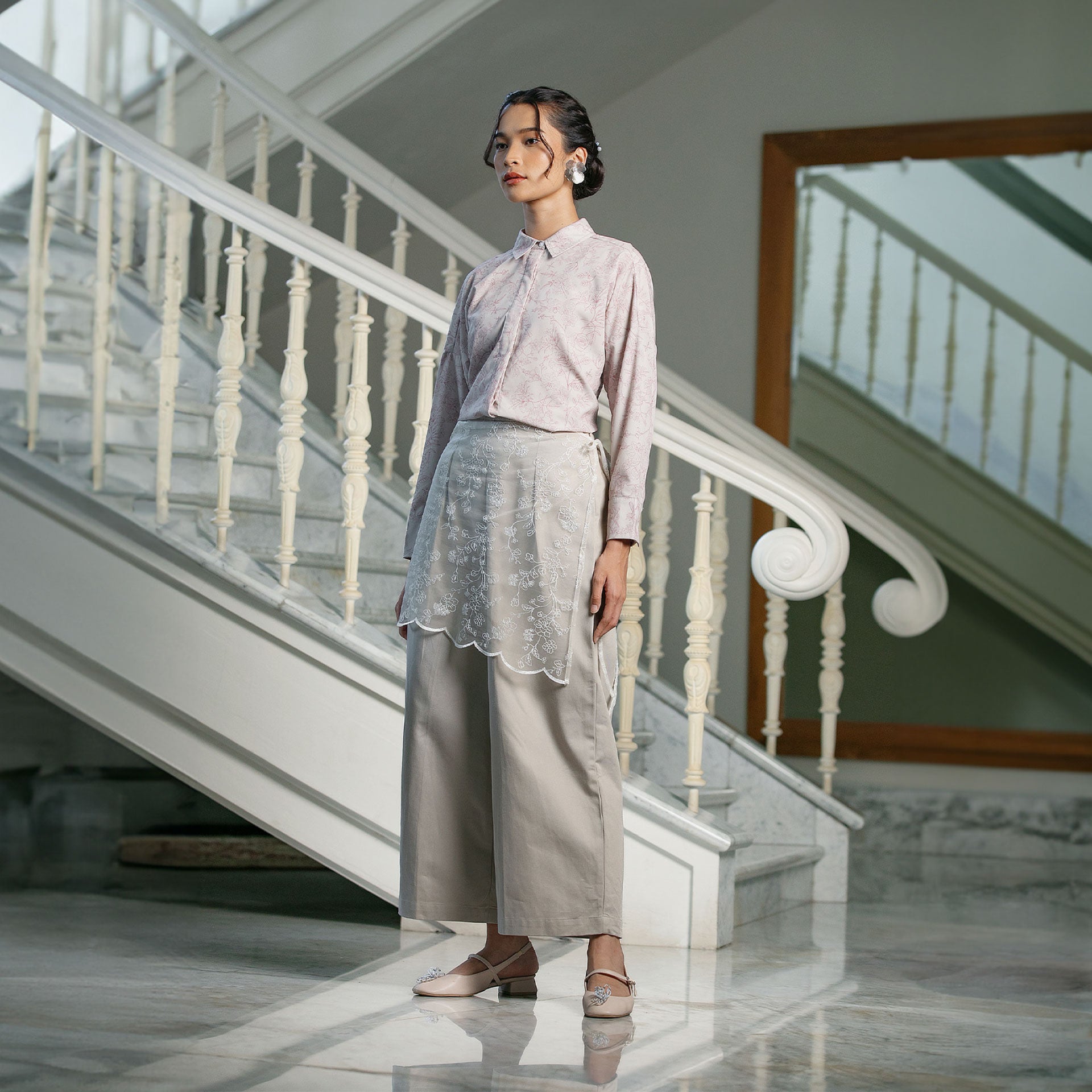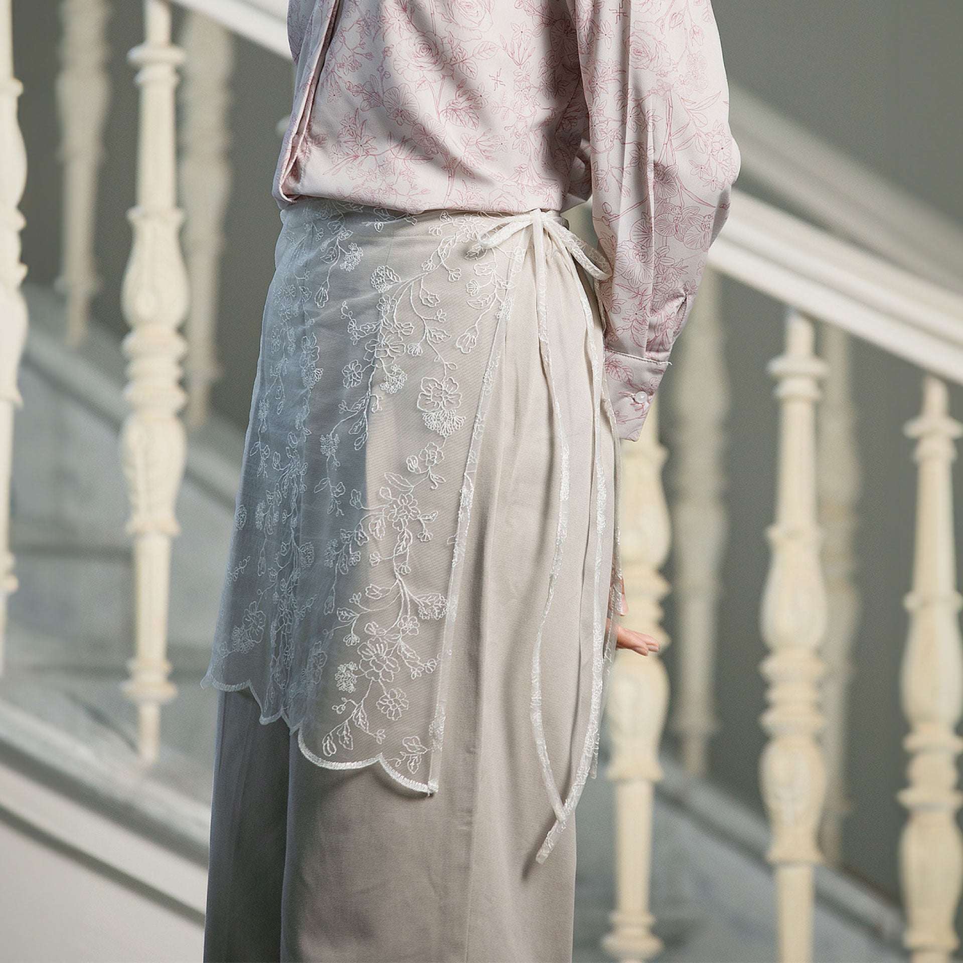 Detail: Karet bagian belakang, saku pinggir, siluet lurus, detachable lace apron