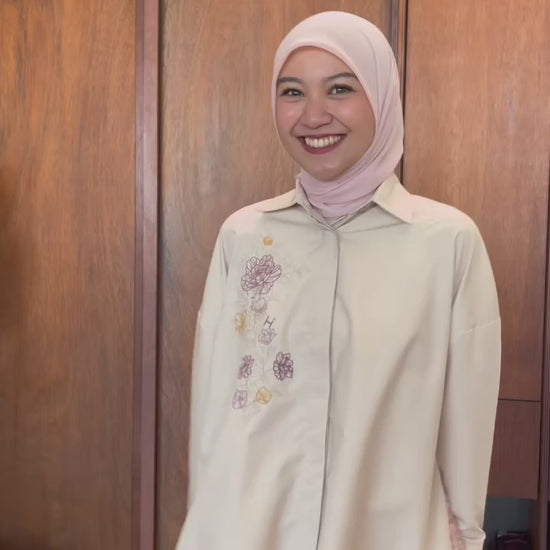 Detail Baju : Silhouette potongan lurus lengan panjang, Detail pleats pada bagian belakang, Motif floral pada bagian pleats, Kerah klasik, Hidden button, Lengan manset, Special button, Detail flower bordir