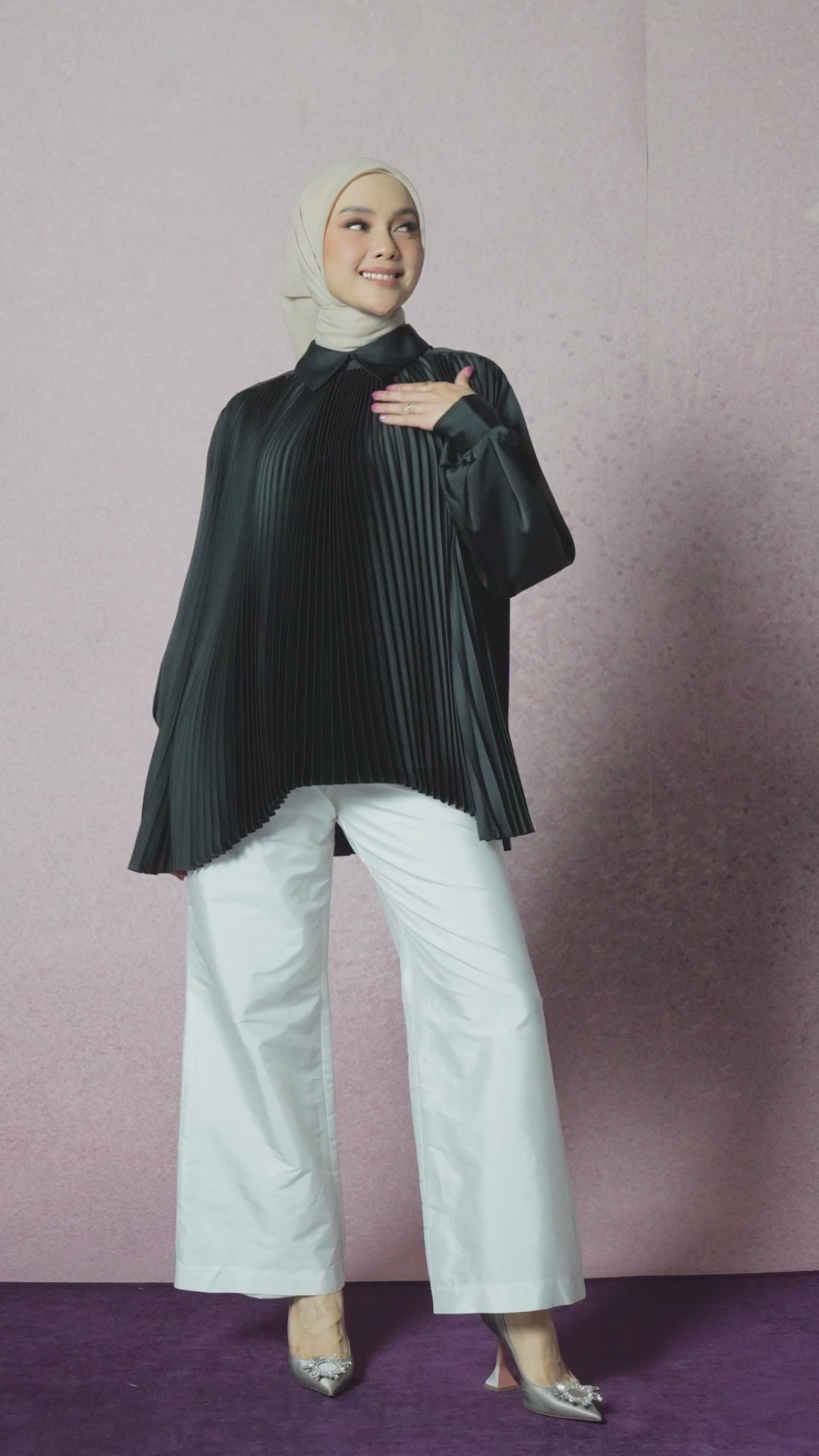 Detail : Kerah kemeja, Body full pleats dengan potongan lebar, zipper belakang, lengan manset