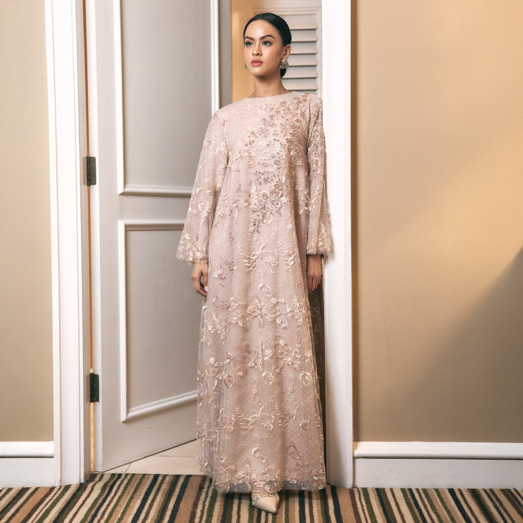 Detail Baju : Dress panjang dengan siluet A-line flowy, detail flower payet