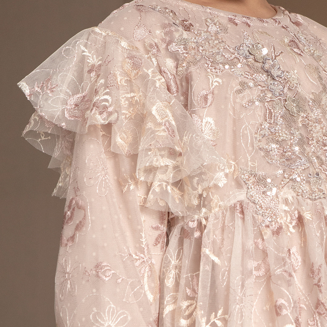 Detail Baju : Siluet loose, ruffle shoulder, detail flower payet
