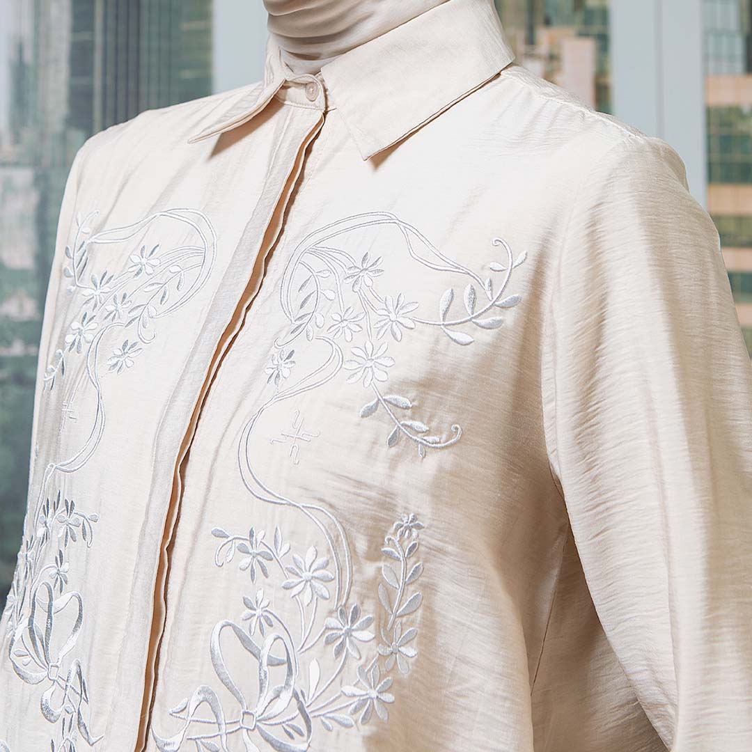 Detail: Kerah kemeja, hidden button, lengan manset, detail flower ebroidery