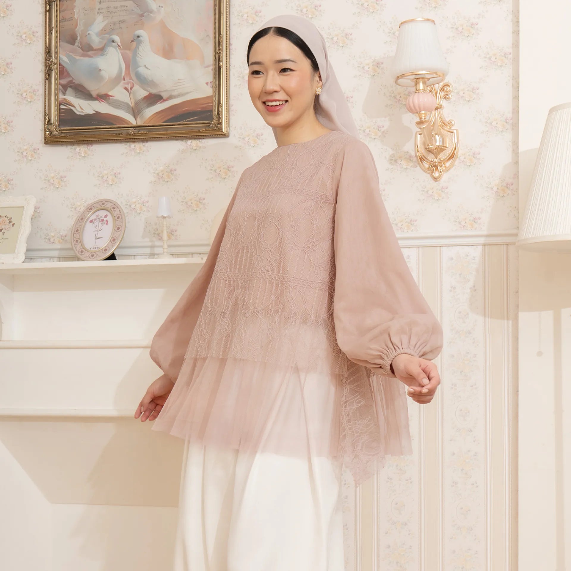 Siluet A-Line, Lengan Pof, Manset Elastis, Furing, Kombinasi Lace Brukat, Peplum Tulle